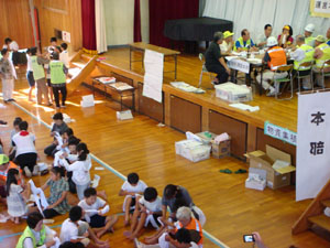 住民は各自酒井根西小体育館に避難し、受付で避難者カードを受取り後、体育館の各地区名ののぼりがある場所に分かれて集合しました。